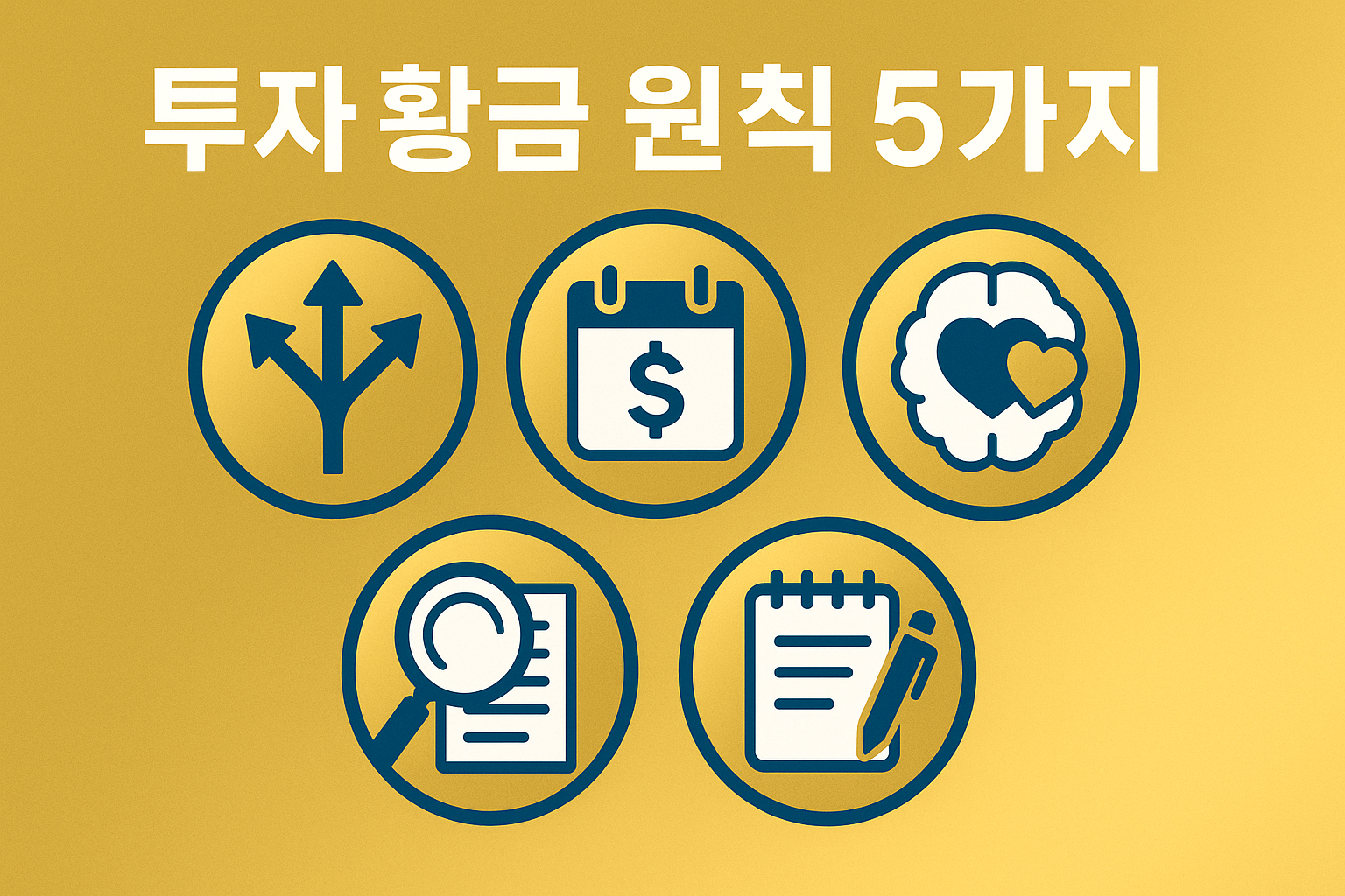 투자 성공을 위한 5가지 황금 원칙을 완벽 정리! 분산투자, 달러 코스트 애버리징, 감정 컨트롤까지. 투자 초보자가 반드시 알아야 할 필수 원칙과 실전 적용법을 단계별로 알려드립니다.